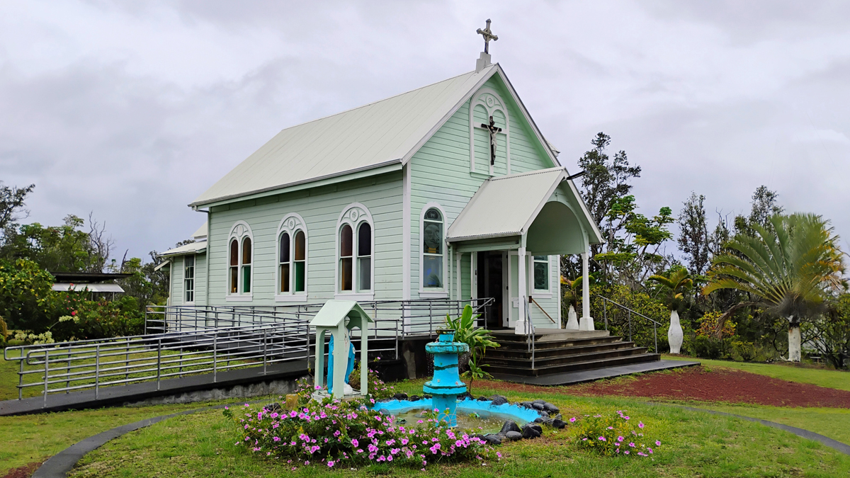 Star of the Sea Painted Church in Kalapana was moved one and a half miles east to its present location in 1990 to avoid certain destruction from Kilauea's advancing lava flows. The colorful, historic Catholic church has been decommissioned by the diocese, but volunteer priests still conduct mass on the first Friday of every month.