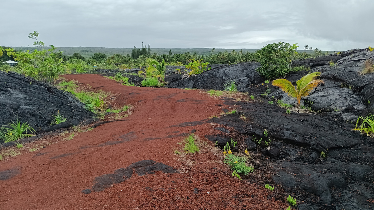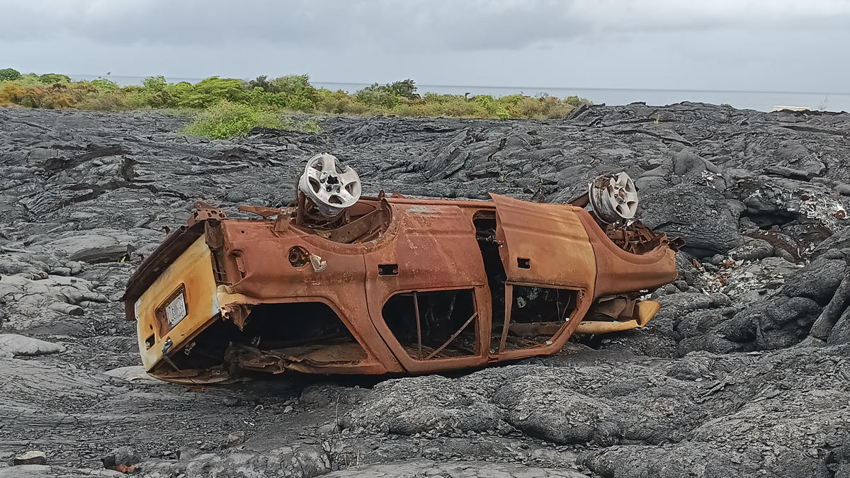Just past the church, we turned onto the section of Chain of Craters Road that is now disconnected from the national park by miles of lava. In the last several decades, lava flows from Kilauea have destroyed the Royal Gardens subdivision, the settlement of Kapa'ahu, most of the nearby towns of Kalapana and Kaimu, and reached the outskirts of Pahoa before turning south into the sea. Off-the-grid communities have now reestablished themselves atop the hardened lava.