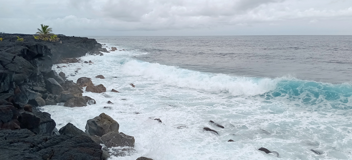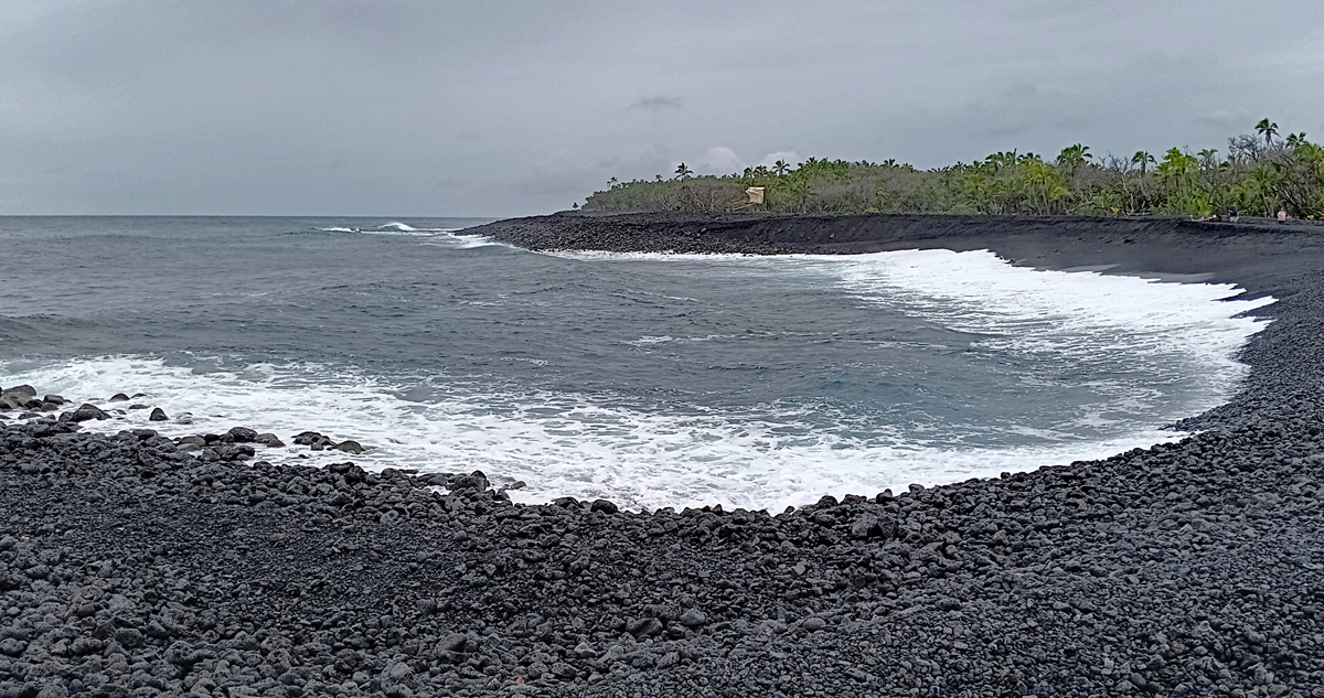 Yesterday, we drove Chain of Craters Road inside Hawaii Volcanoes National Park to its terminus at the Holei Sea Arch, the next seven-plus miles of the former road having been buried beneath lava. Today, we wanted to find the spot where the road emerges from the lava field at the other end, in what remains of the town of Kalapana, in the district of Puna.
