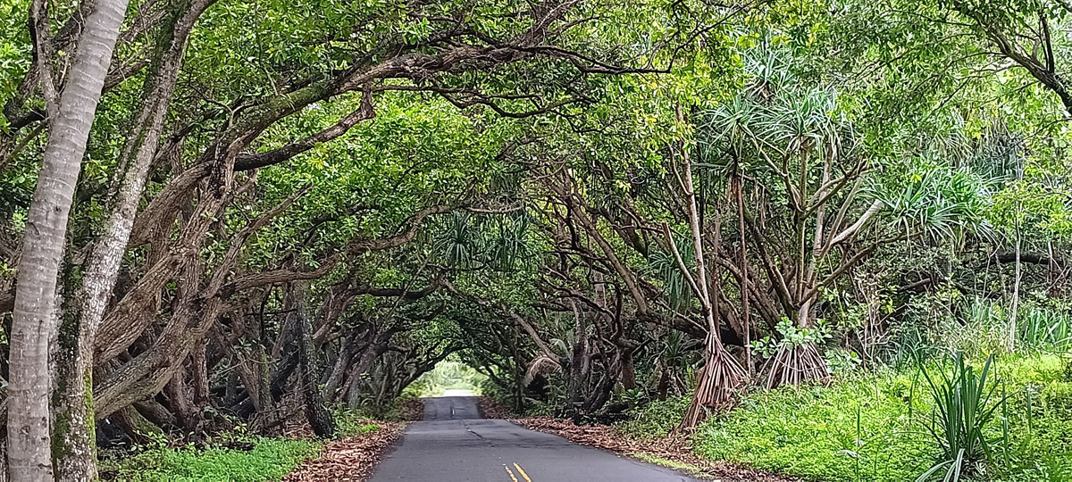 Kalapana-Kapohoe Road is a six-mile-long scenic stretch of road along the island's lush southeast coast. From Kalapana, we drove northwest on the narrow, winding road past rugged sea cliffs, black-sand beaches, tunnels of trees, and endless lava. It takes a certain kind of individual to live in ever-threatened lower Puna. Let's call them open-minded!
