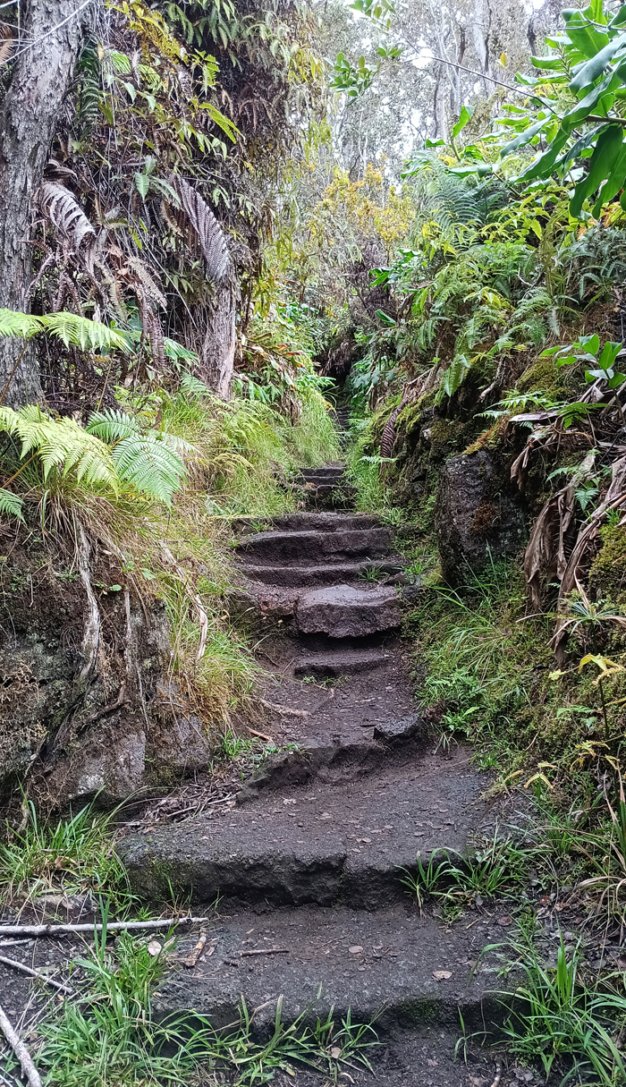The trailhead for the Halema'uma'u Trail begins at the Visitor Center, but the parking was packed, so we backtracked to the Steam Vents and walked from there, which turned a hike of under two miles to a total of 3.4 miles. That's okay. It's good for us.