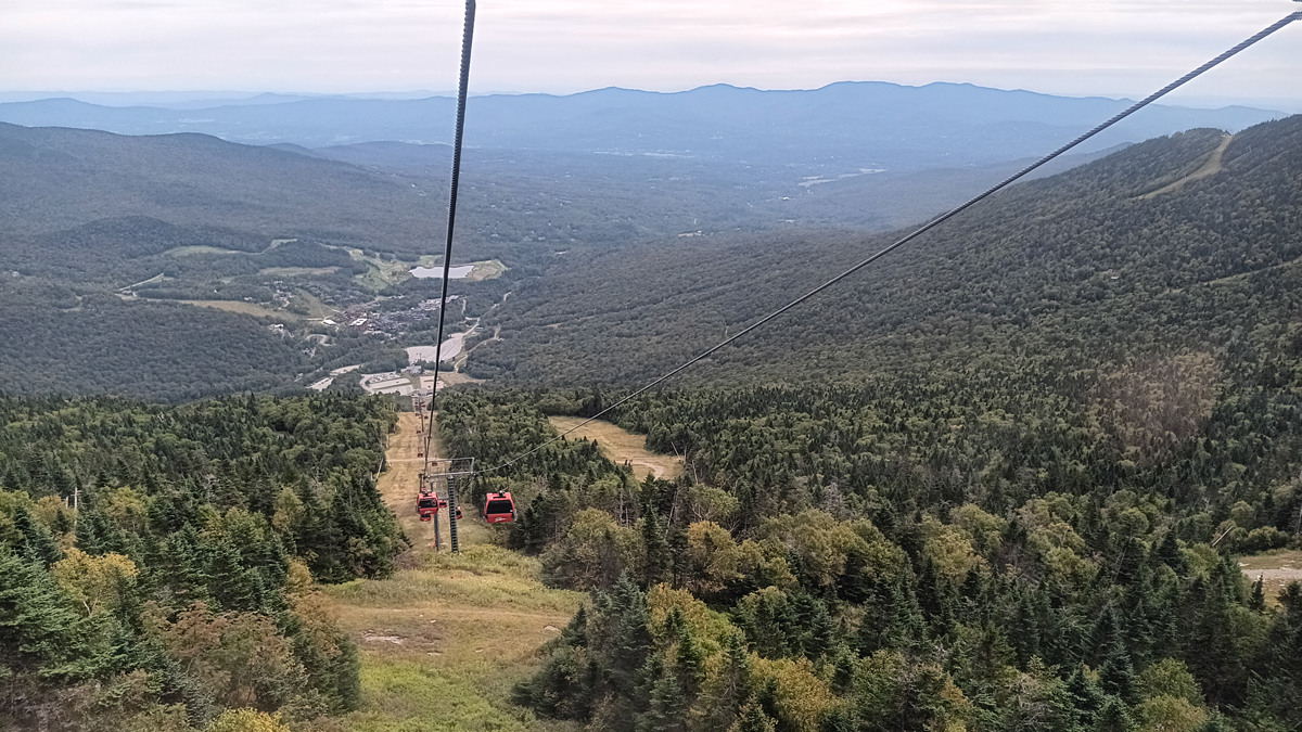 Early in the afternoon, we met Alex and Sarah at the base of the Gondola Skyride, part of the Stowe Mountain Ski Resort. Mount Mansfield, at 4,393 feet, is Vermont's highest peak. Tom and I visited the summit last spring via a different route, but it was raining and foggy that day, and we couldn't see a thing. Today, we'd ride the gondola partway up, then hike/climb the rest.