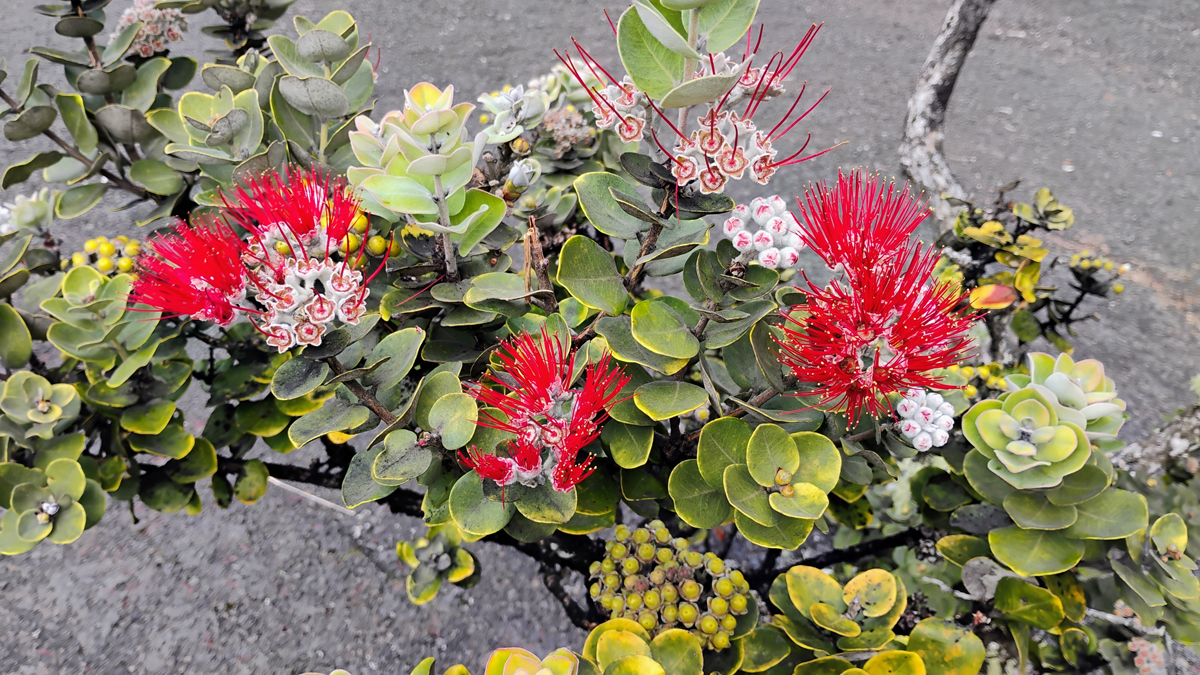 We spent the day exploring the sights along Crater Rim Drive. Uekahuna Overlook is the closest you can get to the flowing lava vents. No lava was visible this morning, just lots of steam. From Uekahuna Overlook, we walked the Crater Rim Trail to the Steam Vents and back, about 1.5 miles round trip.