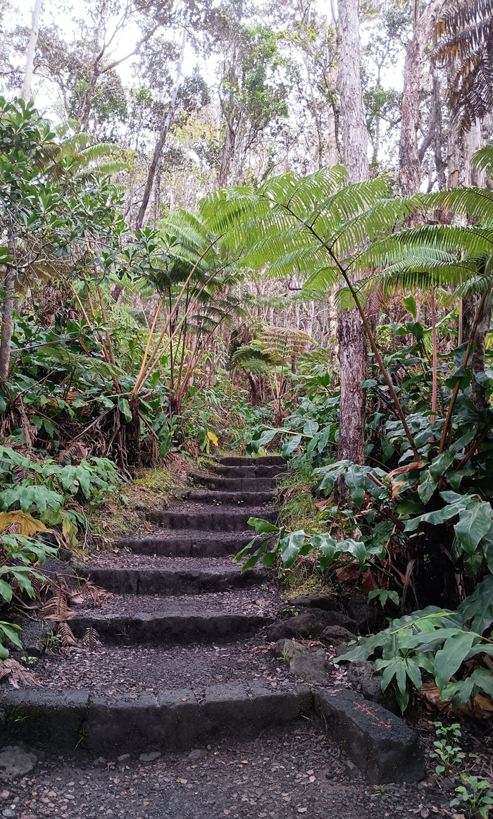 A short side trail leads through the Thurston (aka Nahuku) Lava Tube. There's a boardwalk leading into the tube, stairs leading out, and artificial lights inside. Interesting but pretty tame – and only 600 feet long. We'll have to find a longer, wilder lava tube elsewhere on the island.