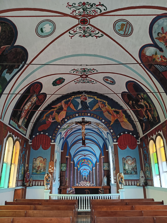Star of the Sea Painted Church in Kalapana was moved one and a half miles east to its present location in 1990 to avoid certain destruction from Kilauea's advancing lava flows. The colorful, historic Catholic church has been decommissioned by the diocese, but volunteer priests still conduct mass on the first Friday of every month.