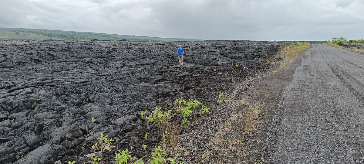 Yesterday, we drove Chain of Craters Road inside Hawaii Volcanoes National Park to its terminus at the Holei Sea Arch, the next seven-plus miles of the former road having been buried beneath lava. Today, we wanted to find the spot where the road emerges from the lava field at the other end, in what remains of the town of Kalapana, in the district of Puna.