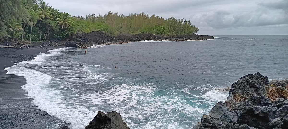 Kalapana-Kapohoe Road is a six-mile-long scenic stretch of road along the island's lush southeast coast. From Kalapana, we drove northwest on the narrow, winding road past rugged sea cliffs, black-sand beaches, tunnels of trees, and endless lava. It takes a certain kind of individual to live in ever-threatened lower Puna. Let's call them open-minded!