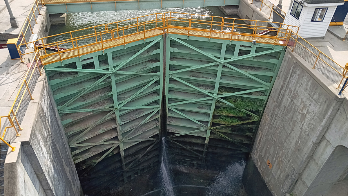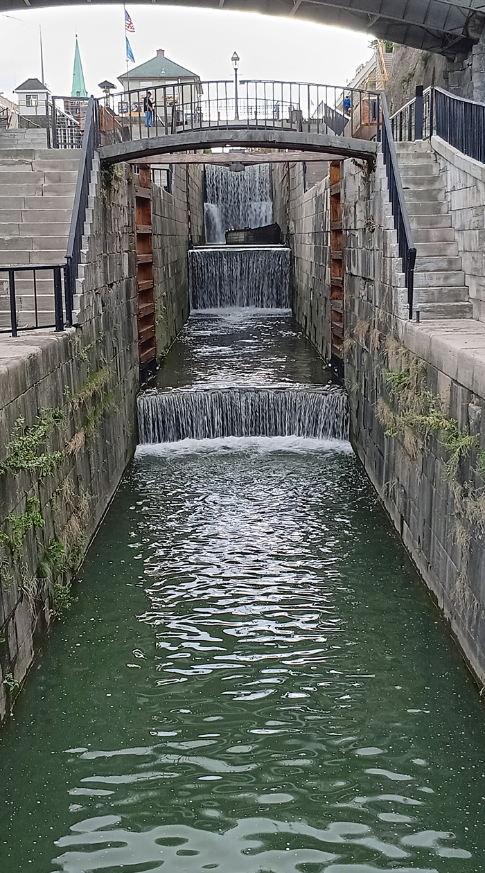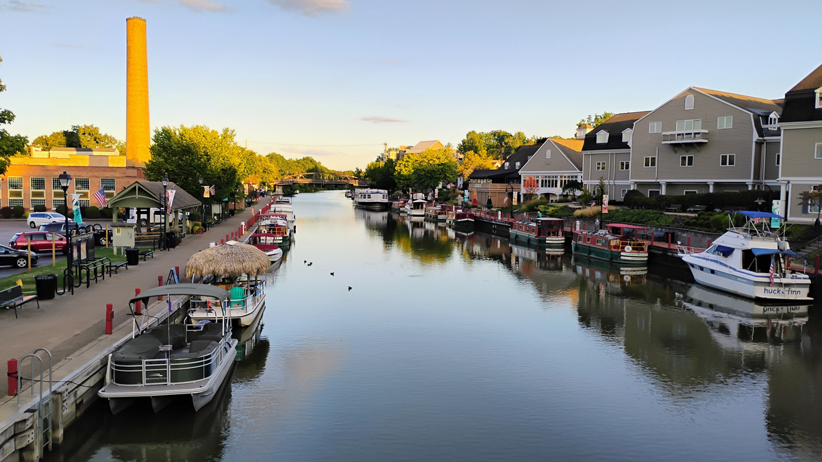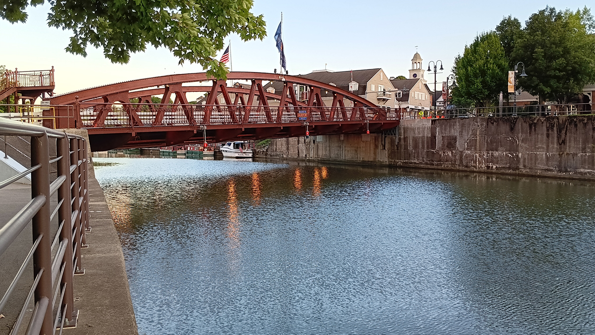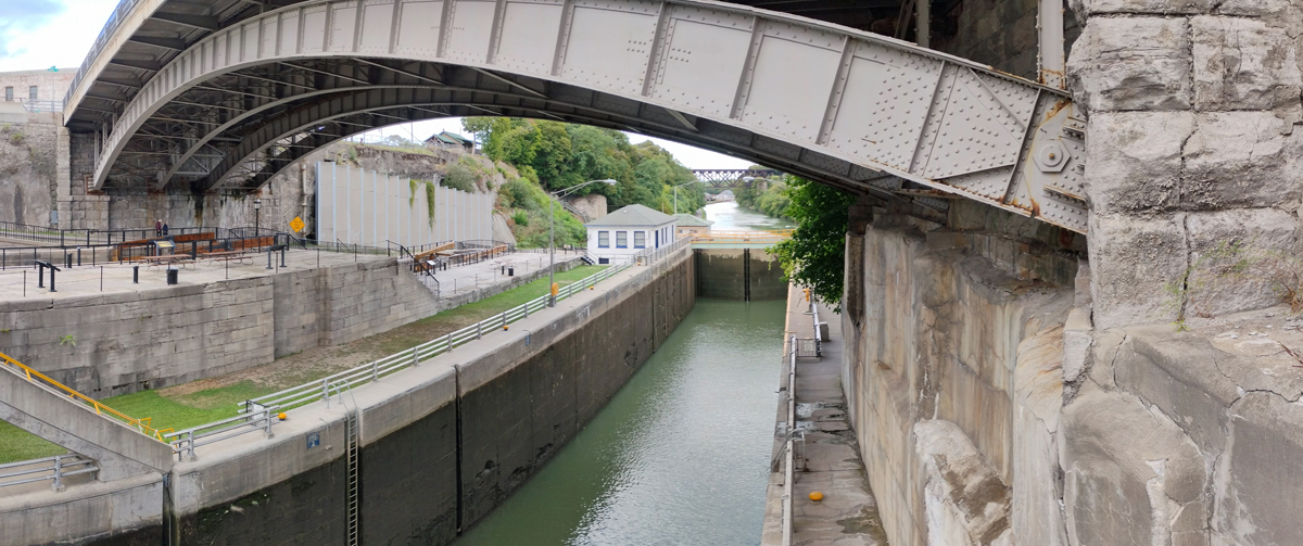 The Lockport Locks Heritage District features the Erie Canal Flight of Five Locks, the largest intact section of the original Erie Canal still remaining. The current iteration of the Erie Canal runs alongside the original here, with just two locks replacing the orignal five.
