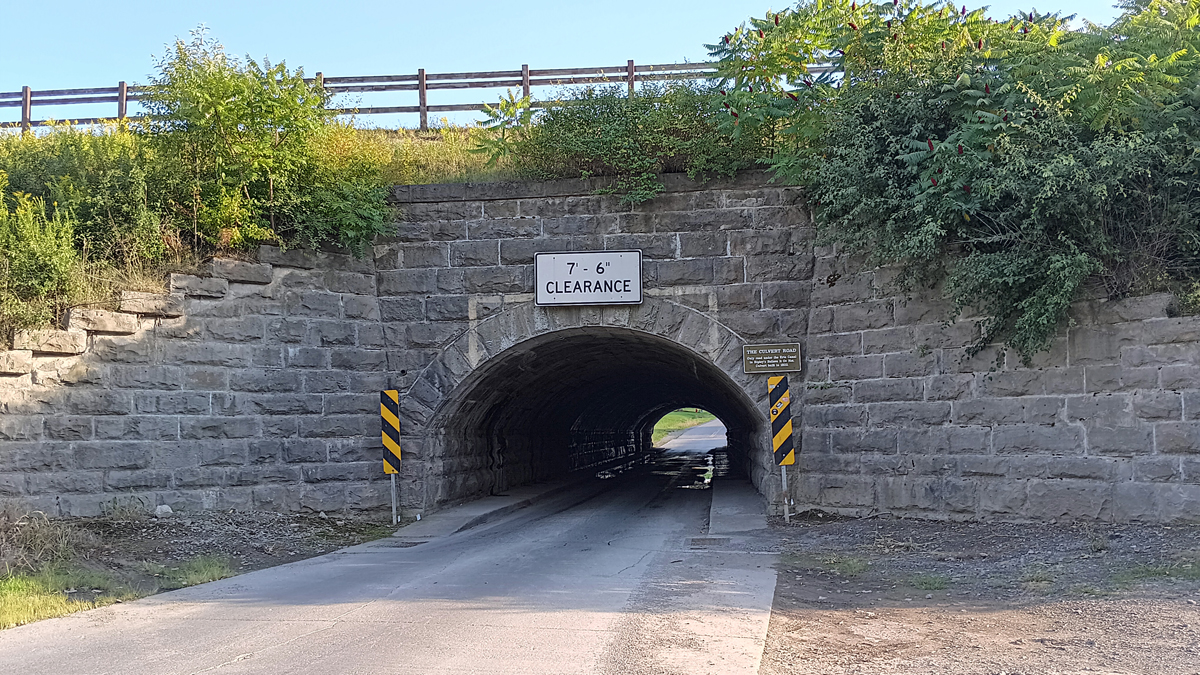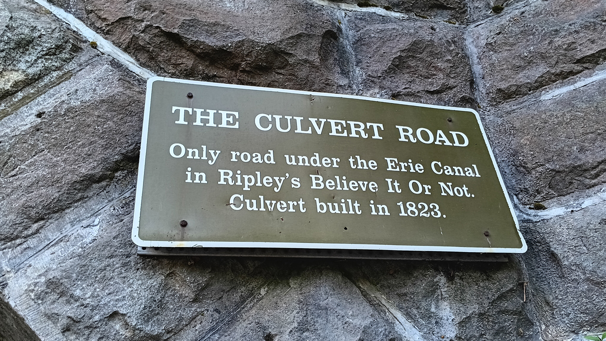 The Culvert Road Tunnel in Medina, NY, is the only place where you can drive beneath the Erie Canal. We drove our car through the tunnel, then pulled over and walked to the top of the culvert to see the waterway that passes overhead. Weird!