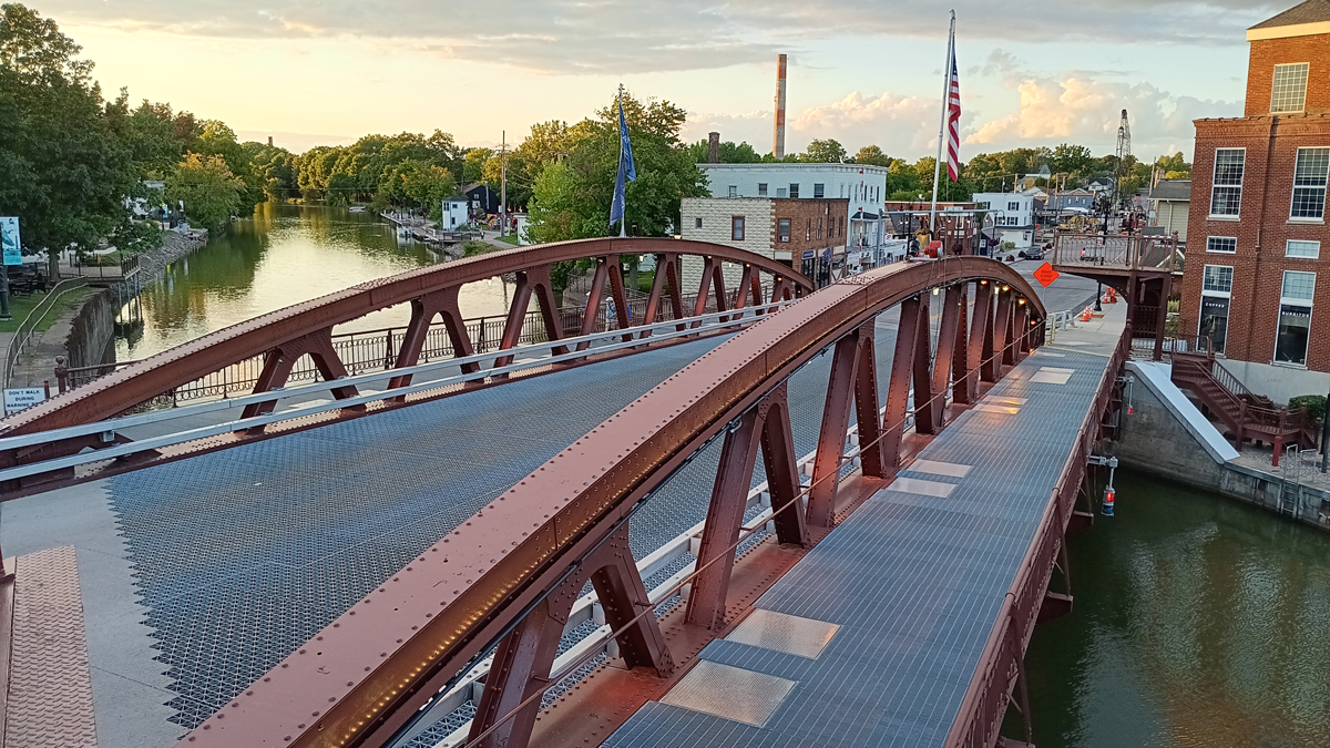 Shortly before sunset, we came to the picturesque little town of Fairport, NY. We climbed a staircase at one end of the Fairport Lift Bridge and talked to the bridge tender. I asked him if I could lift the bridge, but he said we'd at least need to wait for a boat to come by. Dang!