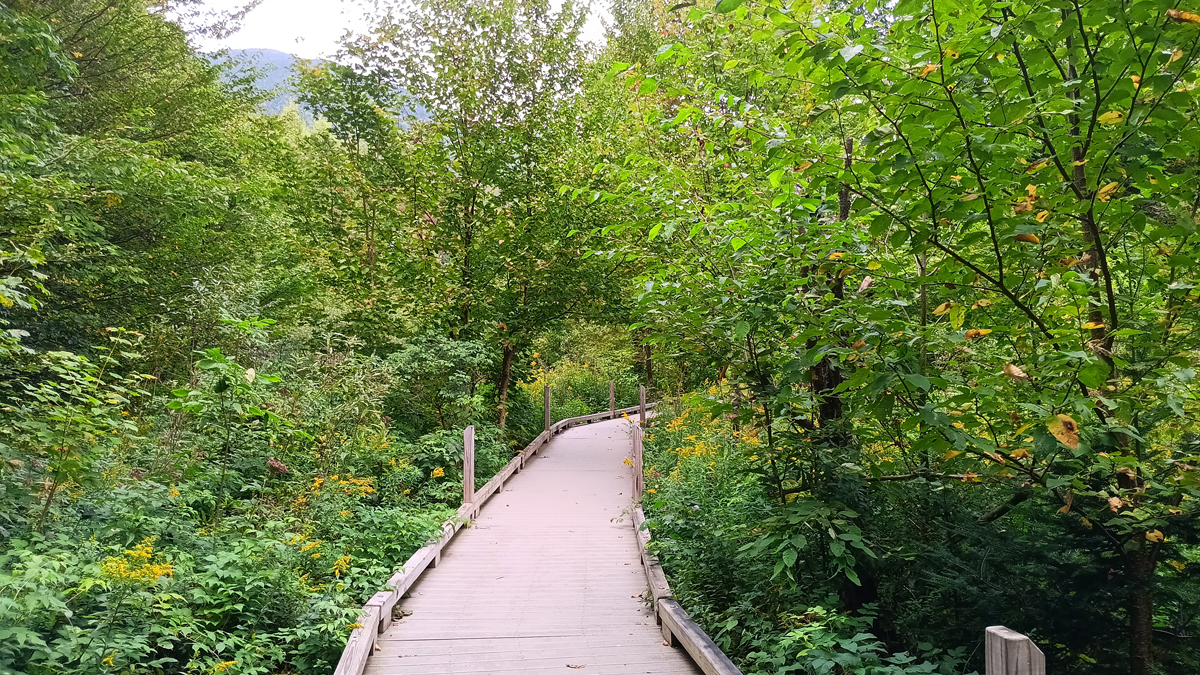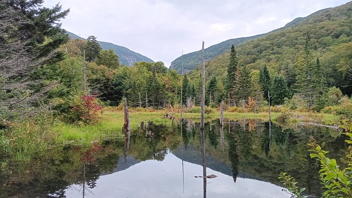 This corridor is now preserved by Smugglers' Notch State Park, where a 3 ½-mile scenic road winds through the pass. We walked a short boardwalk to a beaver pond with a great view of the notch, then stopped at a forested picnic area for lunch.