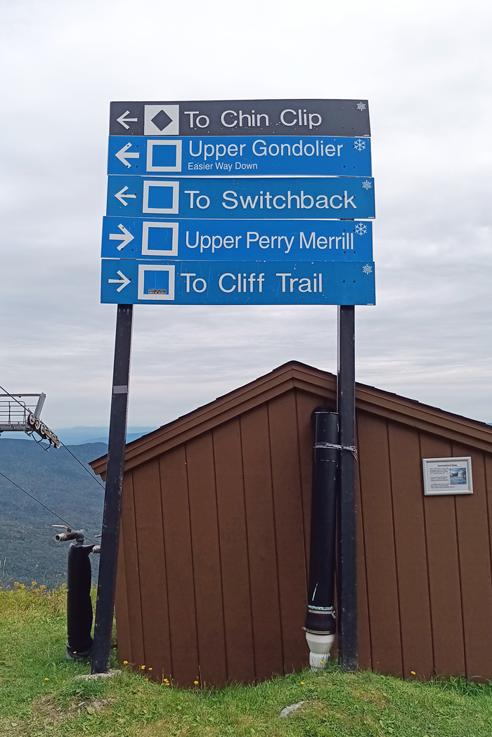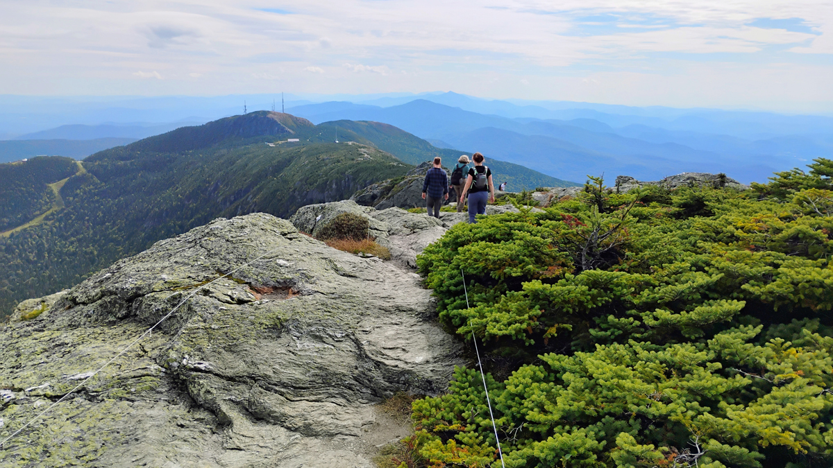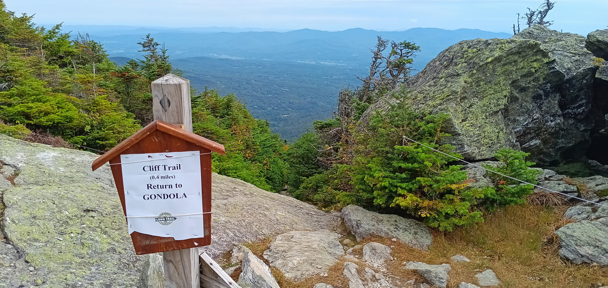 Mount Mansfield from afar resembles an elongated face, with The Chin as its highest point. From the top of the gondola, you're still 900 vertical feet below the mountain's ridge. The shortest route to the top is via the VERY STEEP Cliff Trail, which connects to the Long Trail before reaching the summit.
