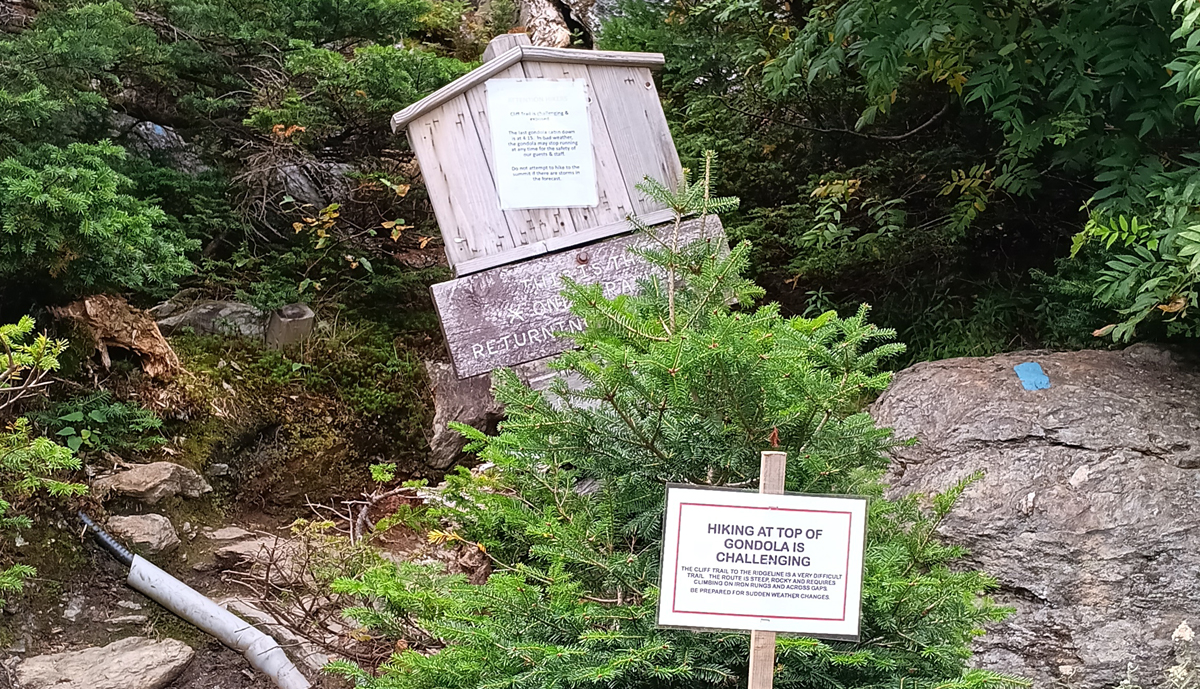 Round-trip between the gondola and The Chin is only 1.6 miles, but the Cliff Trail is no joke. Still, we were game to do it. Super fit and much younger Alex and Sarah were very patient with Tom and me as we tortoised up the trail.